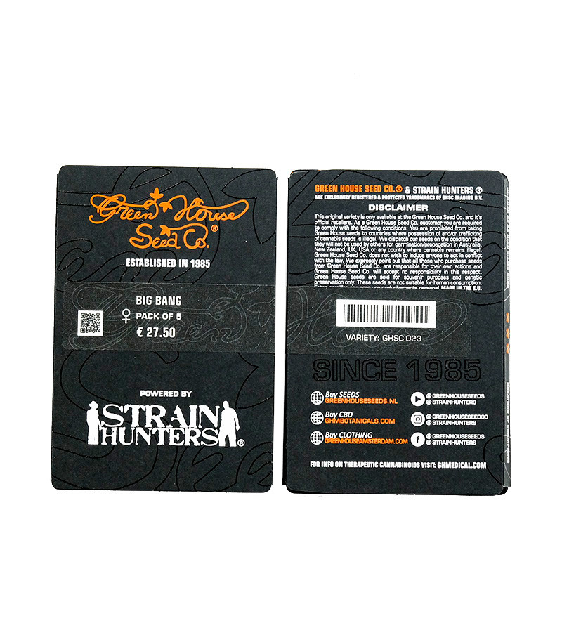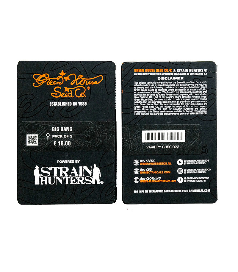 Big Bang («Большой взрыв») – феминизированный высокоурожайный сорт с быстрым цветением, легкий в уходе и культивации, что очень хорошо походит для начинающих гроверов. Благодаря своим свойствам, в 2000 году этот сорт занял третье место на High Times Cannabis Cub.