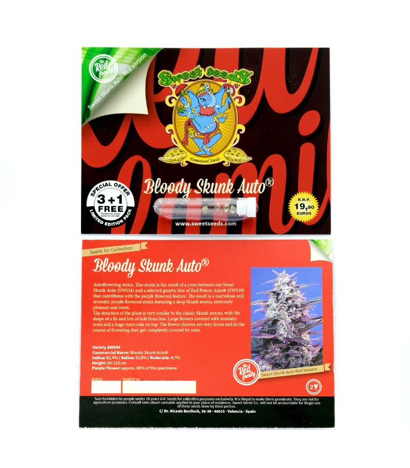 Bloody Skunk Auto («Кровавый сканк») - сканковый сорт от банка семян Sweet Seeds представляет собой коноплю фиолетового цвета с автоматическим цветением и традиционным глубоким сканковым ароматом. Благодаря своим качествам, сорт завоевал второе место в категории автоцветов на III Copa Cannábica Expogrow в 2014 году.