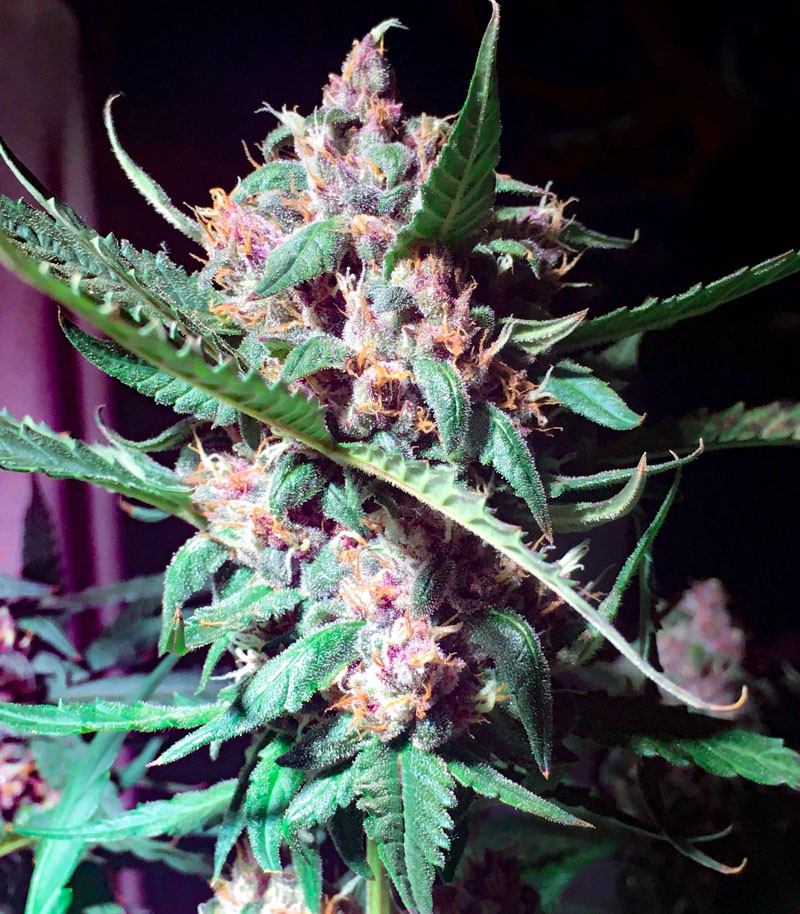 Во время цветения шишки покрываются обильным слоем белоснежных трихом, которые переливаются на свету яркими красками. Ближе к харвесту они приобретают темный лиловый окрас, который настолько глубок, что кажется почти черным. Благодаря большому количеству трихом и обильной смолистости сорт идеально подходит для создания концентратов.