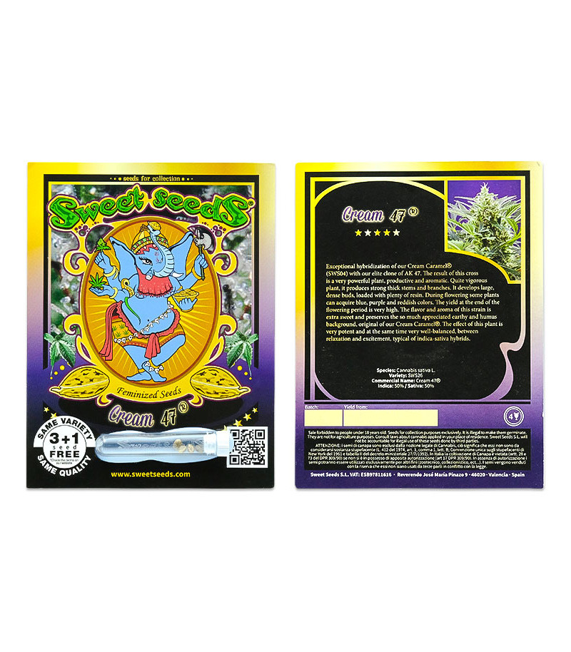 Семена конопли Cream47 – удивительно мощный, энергичный и ароматный потомок известной культуры Cream Caramel и элитного клона АК-74. Обладает сладким карамельным вкусом и запахом. Благодаря соотношению индкики и сативы 50 на 50, дает сбалансированное ощущение внутренней энергии и мышечного релакса.