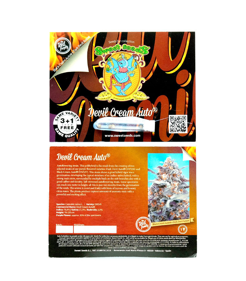 Оригинальная версия Devil Cream Auto разработана бридерами сидбанка Sweet Seeds путем скрещивания специально подобранных штаммов черного цветка Dark Devil с изысканным кремовым ароматом, и фиолетового классического автоцвета SWS38. Это - один из популярных гибридов среди истинных ценителей каннабиса.