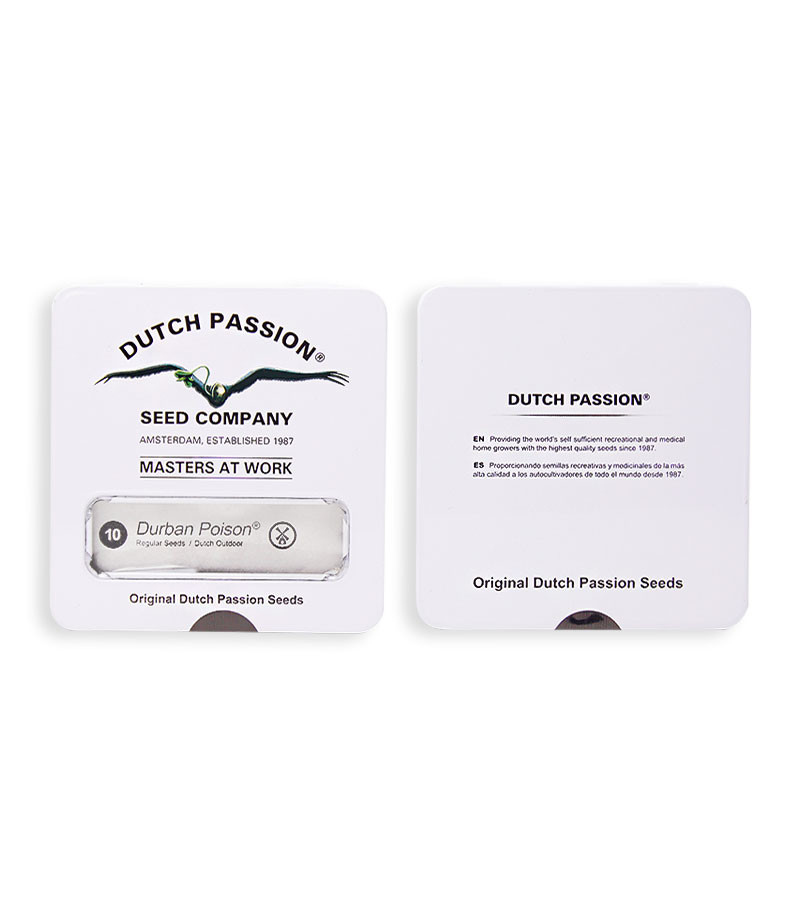 Эта сатива никогда не скрещивалась с неродственными сортами для улучшения своих качеств. Durban Poison reg имеет южно-африканские корни и было акклиматизировано бридерами Dutch Passion в Голландии. Получилось растение, которое прекрасно растет и хорошо себя чувствует в ветреной и дождливой Северной Европе.