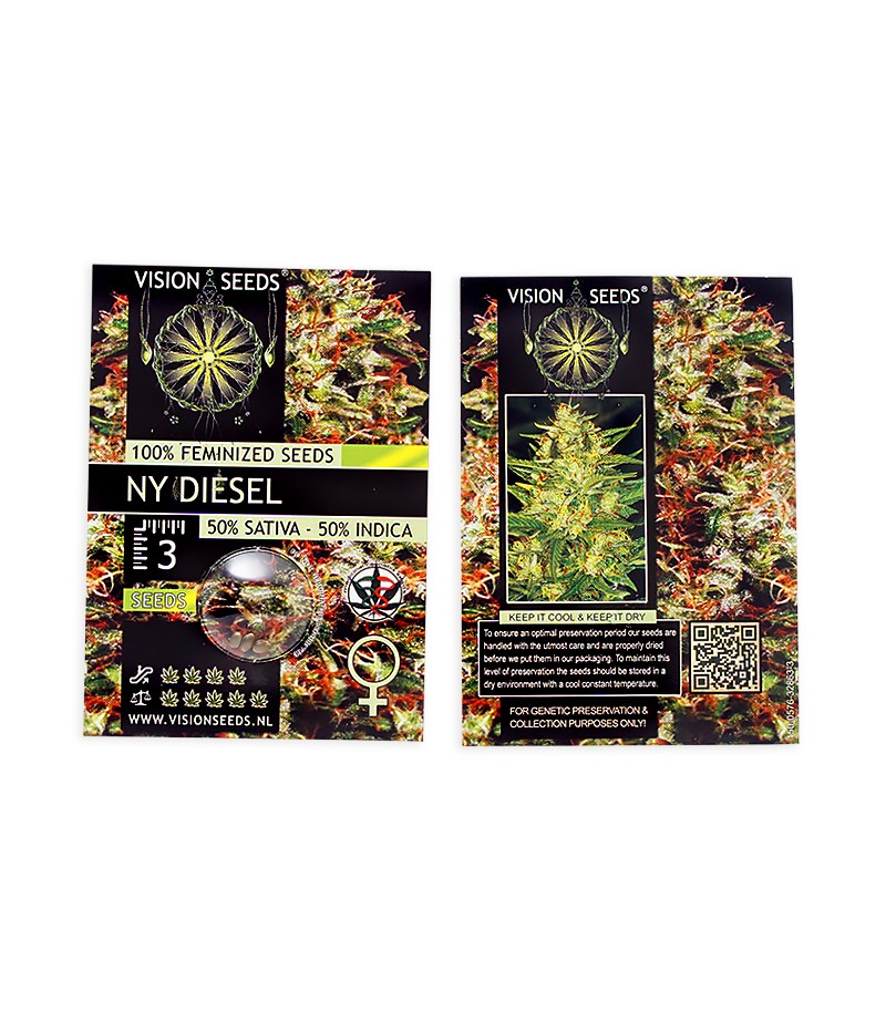 Семена конопли NY Diesel – это феминизированный сорт сидбанка Vision Seeds. Он прост в выращивании и не требует создания особых условий. Этот гибрид объединил индику и сативу, смешение которых привело к созданию удивительного гибрида. Например, в помещении размер растения не превысит 70 сантиметров, но вот на улице маленькое семечко превращается в громадное дерево с огромными шишками.