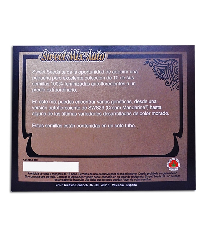 Миск семян Sweet Mix Auto - интереснейший микс из 10 феминизированных автоцветов на любой вкус и цвет. Среди них отдельно стоит выделить Cream Mandarine Auto с уникальным молочно-цитрусовым вкусом и ярким творческим эффектом, и Red Poison Auto - красивейший сорт с мощным сбалансированным эффектом.