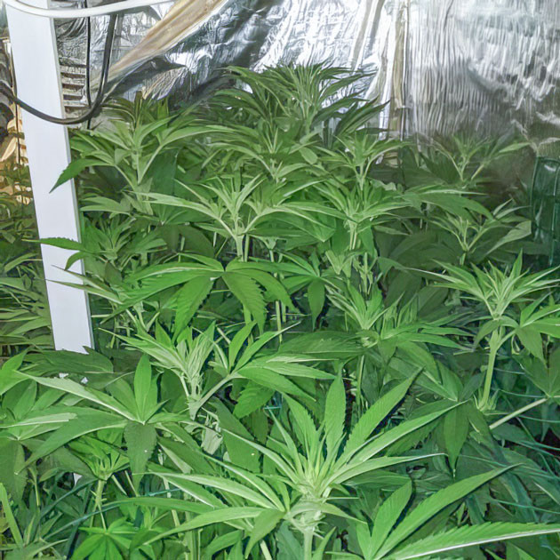 На четвертой неделе я включил вторую лампу, после этого расставил растихи в боксе таким образом, чтобы с переходом в цветение у каждой из них было достаточно места. К концу недели их рост был в районе 35 сантиметров. Листва очень широкая, с мутацией в виде девяти пальцев, тёмно-зеленого цвета. Удалил на кустиках по паре самых больших лопухов. Единственная проблема, с которой я не могу справиться, – температура раствора. Вёдра быстро нагреваются до 28-30 °C, а компот в них должен быть прохладней, около 22 °C. Впрочем, на состоянии кустиков это никак не отражается, нет признаков стресса или каких-то проблем.