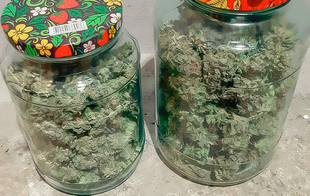 После харвеста постепенно убрал все ветки, разложил их на газете для первичной подготовки. Небольшую часть мелких шишек взял домой — для пробы и тестовой сушки. Основные ветки развесил на веревке в соседнем с боксами помещении. Условия выдерживал стабильные: температура около 20 °C, влажность примерно 50 %. В таком виде шишки провисели около шести суток. После этого я снял их и переложил в банки. Общий объем получился около 5 литров.