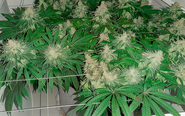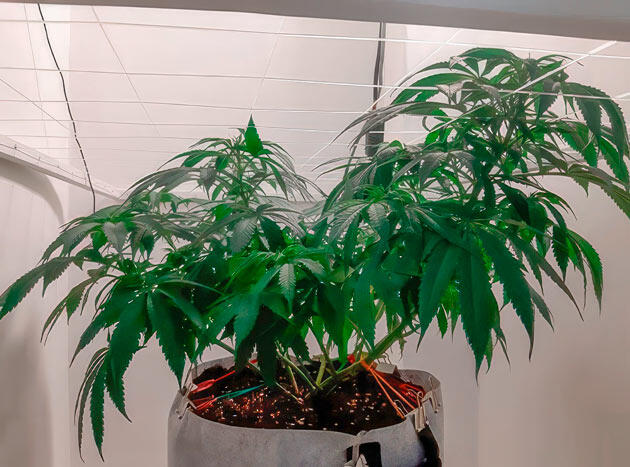 В начале девятой недели провел небольшую дефолиацию — удалил четыре лишних листа. На 59-й день передвинул под сеткой центральный побег, но в целом растение все еще выглядело маловатым для перехода на цветение. Обычно на этом сроке я уже ставлю фотикам режим 12/12, но здесь решил дать Гуле немного больше времени. На тот момент выше сетки пробивалась только центральная ветка и еще одна с противоположной стороны. Планировал завершить цикл «удобрения + чистая вода» и только затем переводить на цвет.