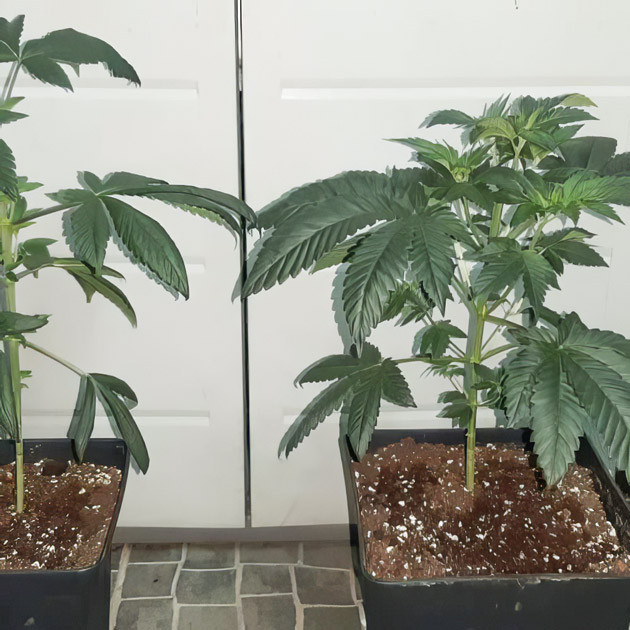 В начале шестой недели провёл топпинг, удалив макушки на обоих кустах. После обрезки дал по 400 мл воды с Bio Enhancer, концентрация 0,4 мл/л. Как только растихи пришли в себя от топпинга, заметил небольшую разницу фенотипов. Не могу сказать, что это плохо, так даже интереснее. Поливаю кусты раз в 2-3 дня, чтобы не залить, ориентируясь на просыхание почвы. Стабильность условий и умеренная подкормка дают о себе знать: кусты не стрессуют, выглядят здоровыми и постепенно развиваются.